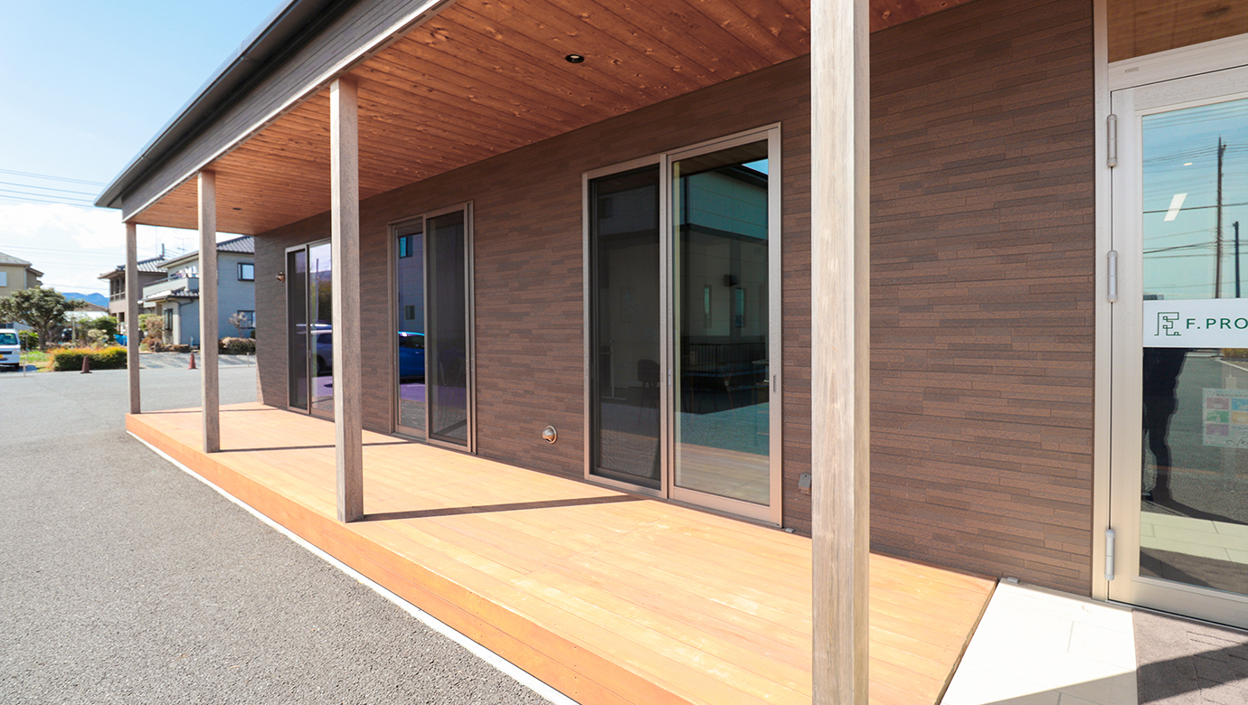 自然素材に囲まれたカフェスタイルの平屋ショールーム
